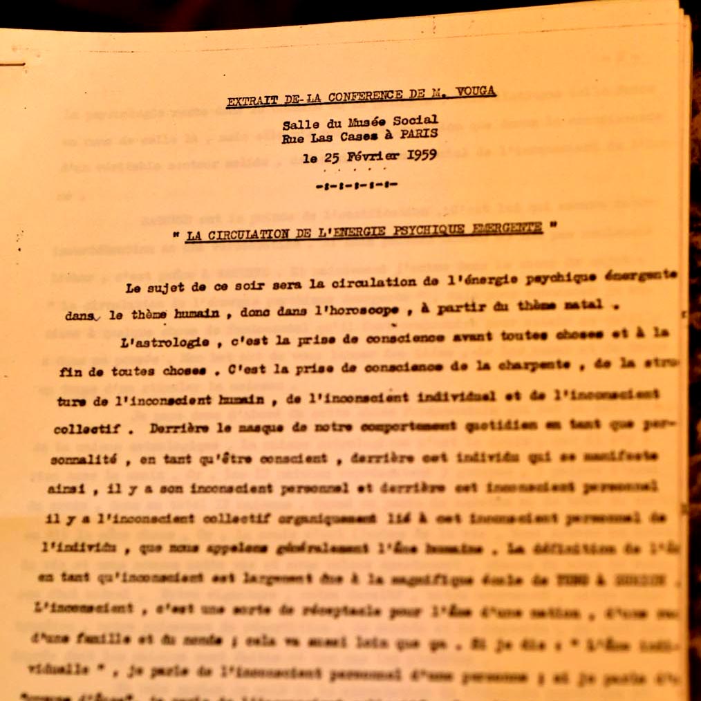 | 25/02/1959 | Circulation de l'énergie psychique émergente. Conférence du 25 février 1959 à la salle du Musée Social, rue Las Cases à Paris (parue dans "Astrologie expérimentale" de C.Vouga) [78] | 1h04 |