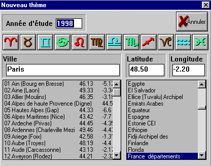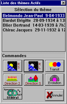 NOTA: Les couleurs utilisées pour l'affichage de chaque élément de la liste sont celles définies pour le "Thème Natal", dans le dialogue "Couleurs des Thèmes" du menu "Préférences".