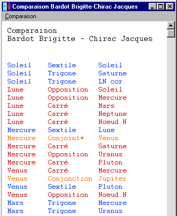 Cette commande permet d'obtenir la liste des inter-aspects (aspects entre les éléments planétaires deux thèmes) entre les deux thèmes: