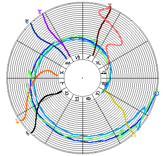 A l'intérieur du Zodiaque, sont représentés les inter-aspects entre les thèmes, c'est à dire les aspects entre les planètes du premier thème et les planètes du second thème.
