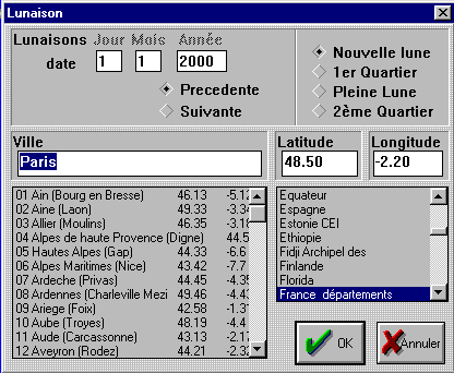 Cliquez sur le bouton correspondant à la phase Lunaire recherchée.Pour informations, ces phases correspondent au aspects Soleil-Lune selon le tableau ci-dessous :
