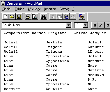 - de présenter la liste des inter-aspects en mode "texte" (illustration ci-dessus) ou en mode "symboles" astrologiques (illustration ci-dessous) .