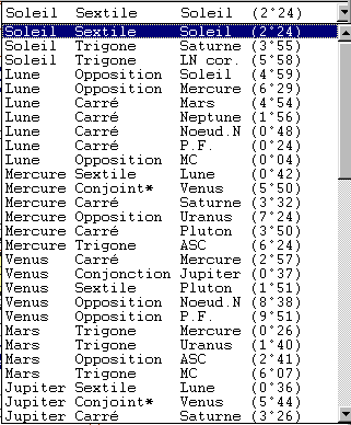 Le Combo-Box présent dans la partie supérieure droite de la fenêtre permet de visualiser la liste des inter-aspects (aspects entre les deux thèmes) avec leurs orbes :