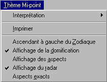 Cette fonction est utile pour repérer rapidement les aspects les plus forts du thème, de par leur précision.NOTA : Pour visualiser les aspects, le menu "Affichage des Aspects" doit être coché.