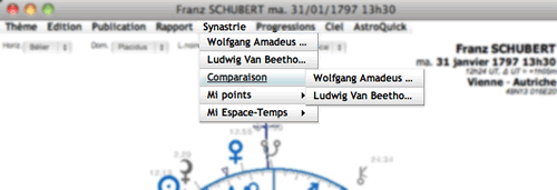 Le première partie du menu Synastrie liste le nom des autres thèmes ouverts.
