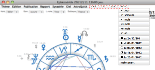 menus ' - << ' et ' >> + ' pour naviguer dans le temps et visualiser les thèmes de lunaisons progressées.