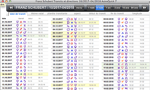 AstroQuick 7.84 avec AstroSimilébrités booste vos connaissances astrologiques à la vitesse de l'éclair ! D'un simple clic et sans formulaire, trouvez les similarités astrologiques parmi plusieurs dizaines de milliers de thèmes de célébrités avec résumé biographique. Les recherches optimisées offrent une multitude de critères : date de naissance, combinaisons Soleil-Ascendant, Soleil-Lune et toutes les multiples positions zodiacales et combinaisons planétaires (versions PLUS et supérieures). Survolez un nom pour afficher instantanément sa carte du ciel, cliquez pour ouvrir son thème astral. Cliquez l'année pour ouvrir la page Wikipédia. Copiez directement la liste pour compléter vos rédactions... L'accès au savoir astro-encyclopédique n'a jamais été aussi facile et rapide ! Pour tout prévoir ! AstroQuick 7 versions PERSO et supérieures offre des fonctionnalités inédites et des performances encore meilleures que les précédentes versions PC ou Mac. Révolutions solaire ou lunaire, Transits planétaires (majeurs et mineurs), Directions (secondaires, symbolique, arc solaire), lunaisons progressées, tous les thèmes prévisionnels peuvent être superposés sur le natal ou tout autre thème. Il en va de même pour les Ingrès par signe et les thèmes de Phases lunaires. Les ensembles de préférences Révolutions, Transits et Directions vous permettent de personnaliser tous les réglages : orbes d'aspects, couleurs, présentation etc. Pour vos travaux et recherches, vous disposez en plus du collage des préférences pour redéfinir les paramètres à tout moment. Avec les nouveaux menus de navigation, par année, date ou phases lunaires, avancer et reculer dans le temps se fait directement d'un simple clic !