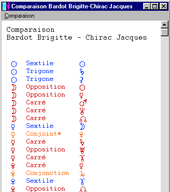- de présenter la liste des inter-aspects en mode "texte" (illustration ci-dessus) ou en mode "symboles" astrologiques (illustration ci-dessous) .