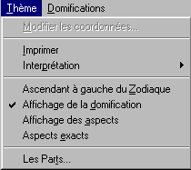 Cette fonction est utile pour repérer rapidement les aspects les plus forts du thème, de par leur précision.NOTA : Pour visualiser les aspects, le menu "Affichage des Aspects" doit être coché.